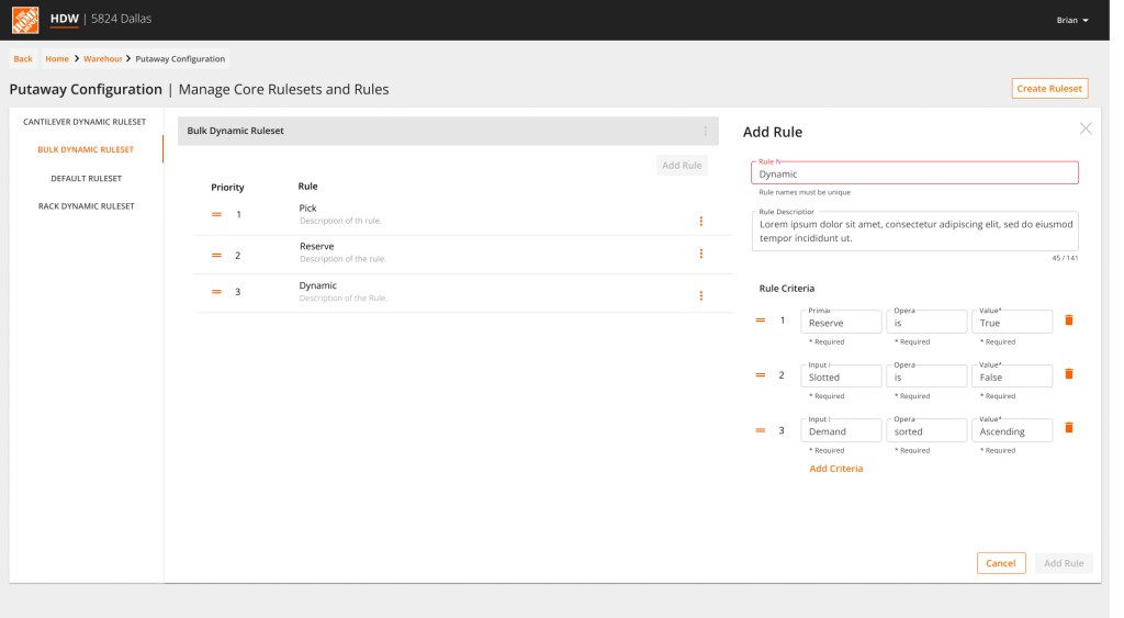 I conducted multiple interviews with operations managers to understand how their current system creates rules for identifying where inbound inventory should be stored, any pain points they experienced, and how they wished the system might function in the future.