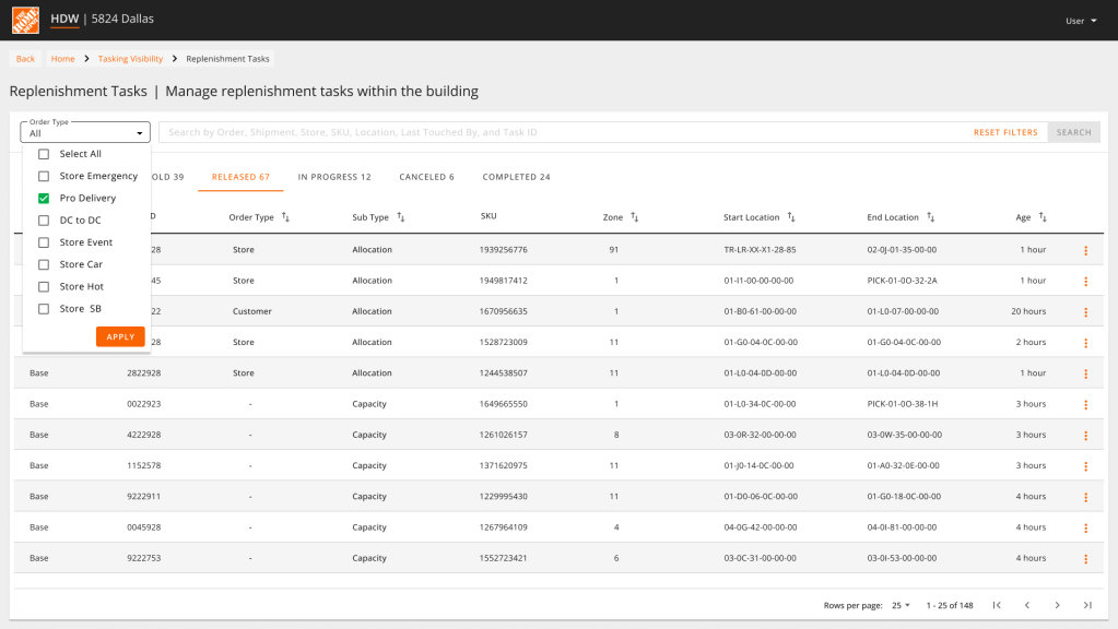 I designed a Replenishment Visibility Tool—a sortable table displaying all tasks for the current shift. They could be sorted by status; Released, In Progress, On Hold, Completed or Canceled. Within each status, tasks were further sorted by priority, with those requiring immediate attention appearing at the top of the list. Real-time updates kept the data current, and users could filter and search tasks using multiple criteria.